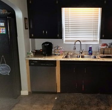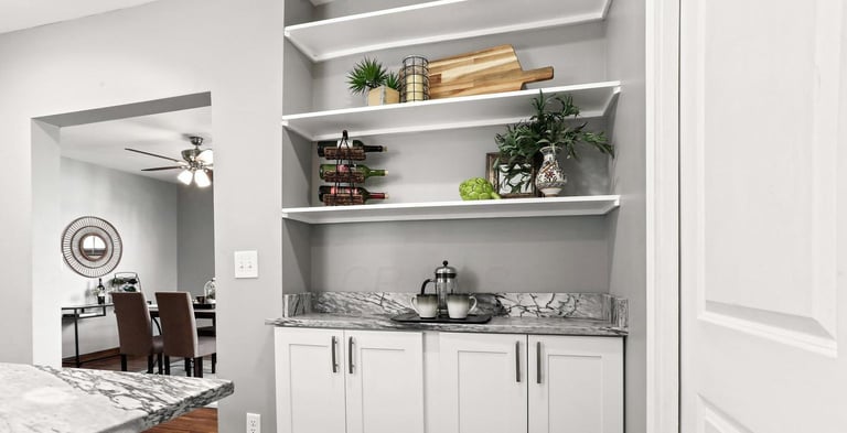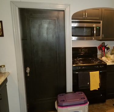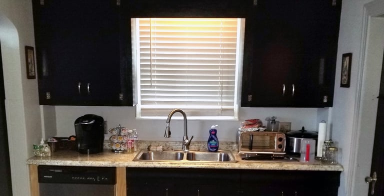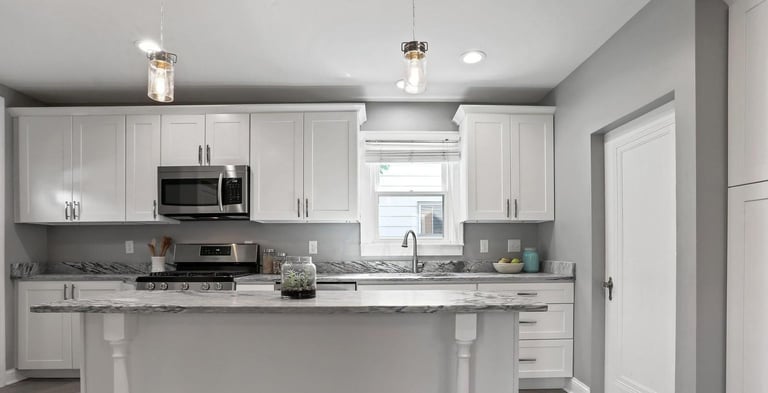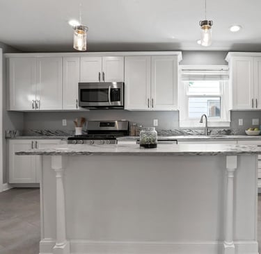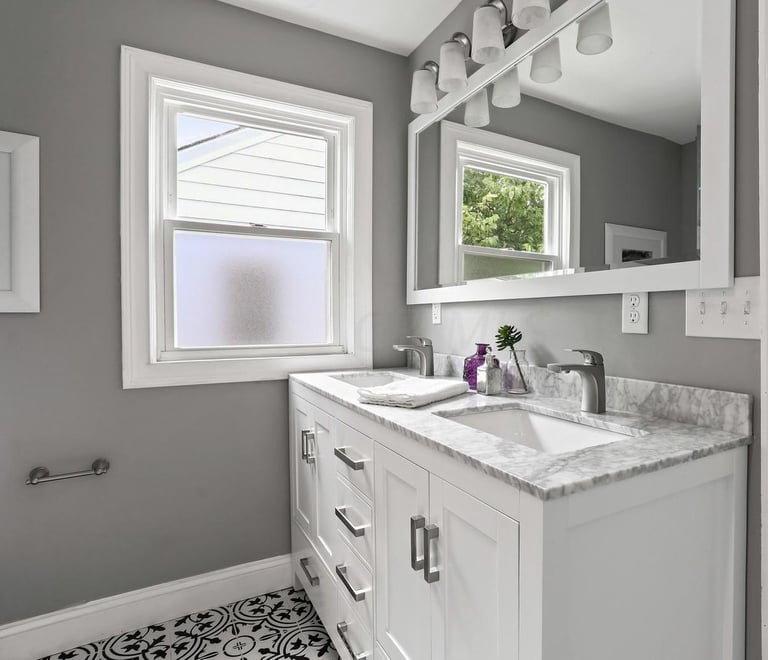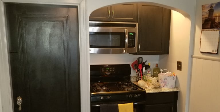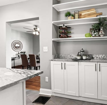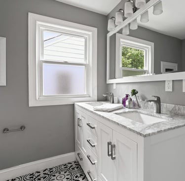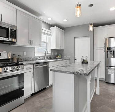 The kitchen was completely gutted. We removed a load bearing wall and hid the header and jacks within the ceiling and walls. The kitchen was completely redesigned and remodeled with new shaker white cabinets, soap stone marble counters and new porcelain tile and new appliances. We also added a half bath in the back of the kitchen. The bathroom upstairs was gutted, and a new tub and double sink vanity were installed. The shower and floor were redone with custom tile work. And new paint, new lighting and plumbing fixtures throughout.