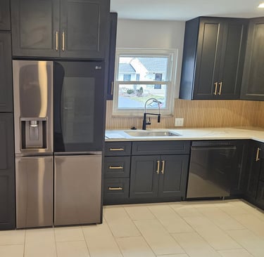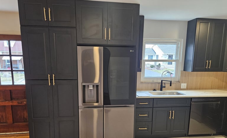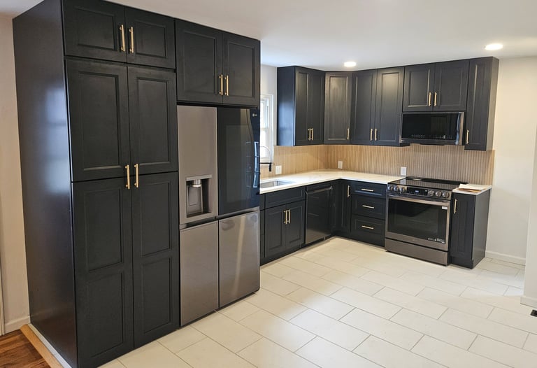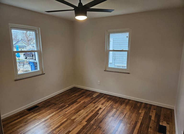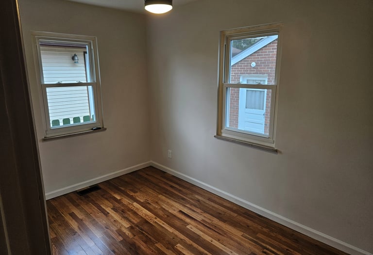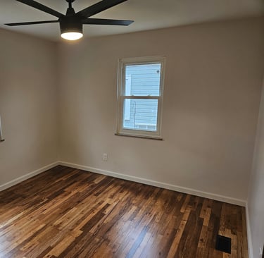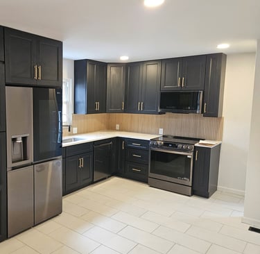The red oak floors were sanded and finished with 4 coats of oil-based polyurethane to give a natural appearance. The kitchen was completely redesigned and outfitted with new black shaker cabinets with 42” uppers, new quartz counter tops, a custom tile backsplash and a hidden pantry style 1st floor laundry. The bathroom was redesigned and remodeled. We added a new walk-in shower with custom tile work, a new double sink vanity and new mirrors. The house was given all new baseboard, new drywall, fresh paint, and new lighting and plumbing fixtures throughout.