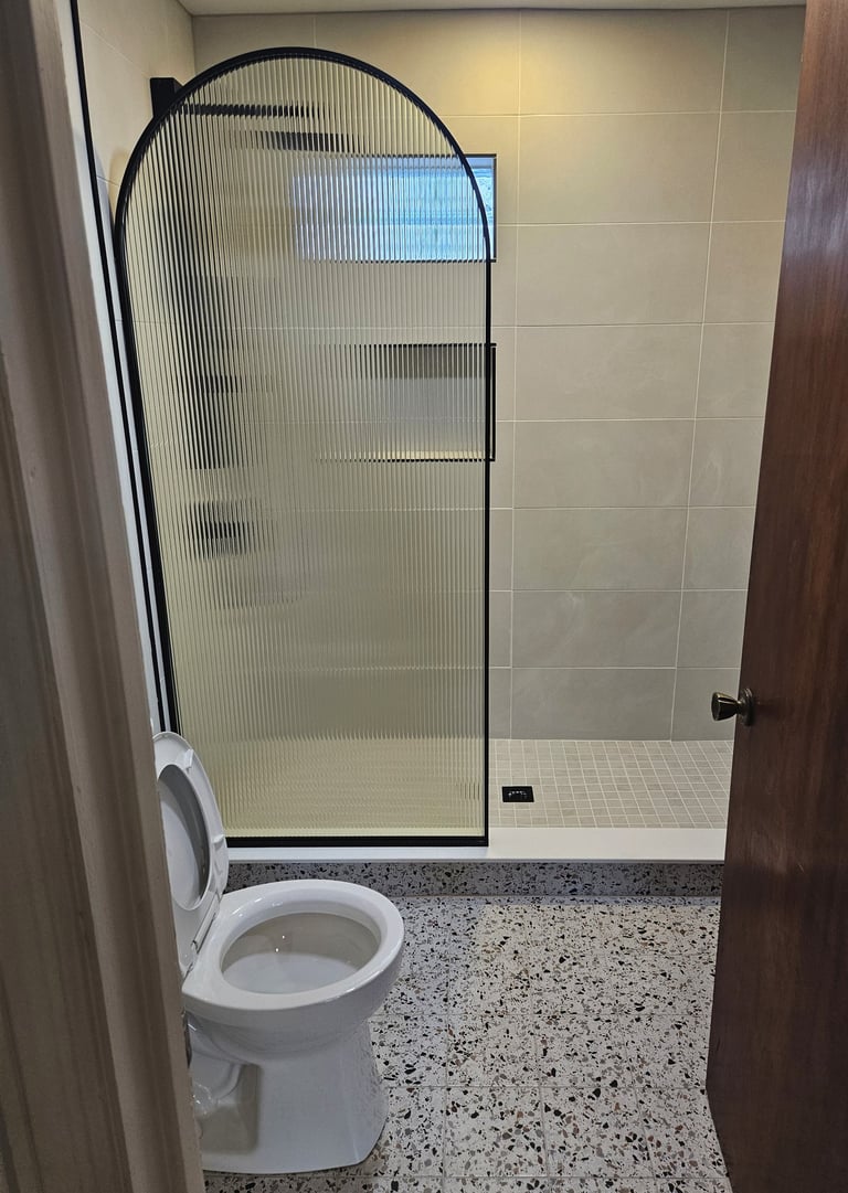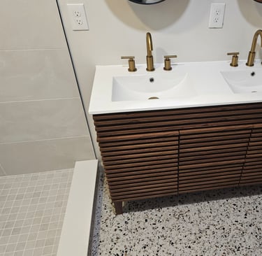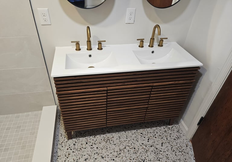 This project was a head-to-toe complete gut and remodel. All new high efficiency HVAC was installed, a new tank-less hot water tank and a new 200-amp electrical panel along with a complete rewire. New wafer (can) lighting was added to the kitchen, living room and shower. The house and garage received a new dimensional roof and new seamless gutters. We deleted and bricked in a window in the kitchen and reduced a bathroom window and replaced it with a new smaller glass block window in the shower. We removed a non-load bearing wall dividing the kitchen and living room, along with the bedroom closets that protruded into the bathroom.
