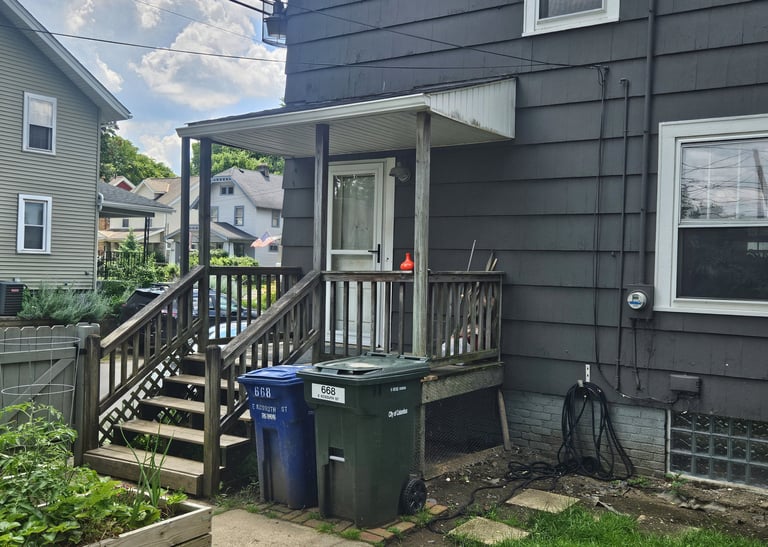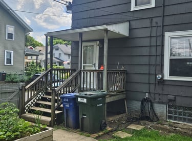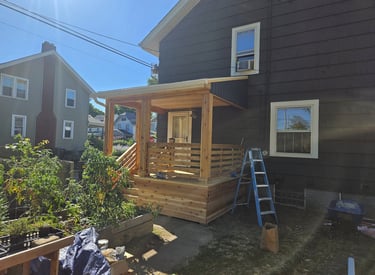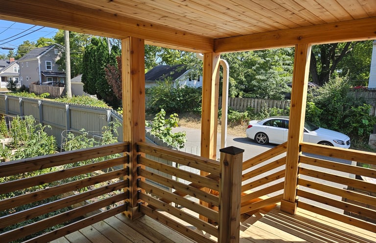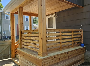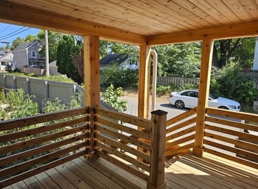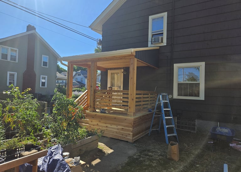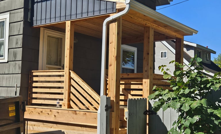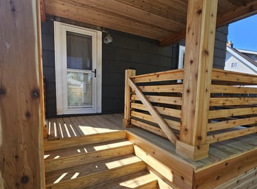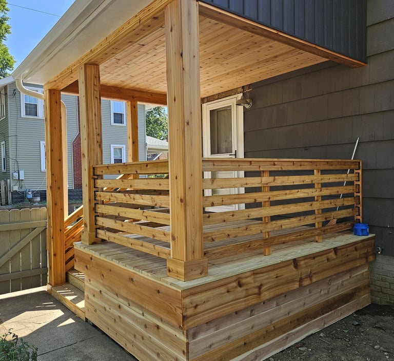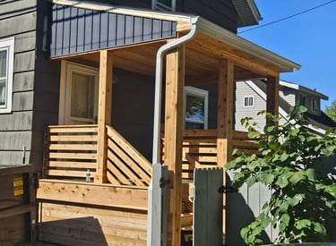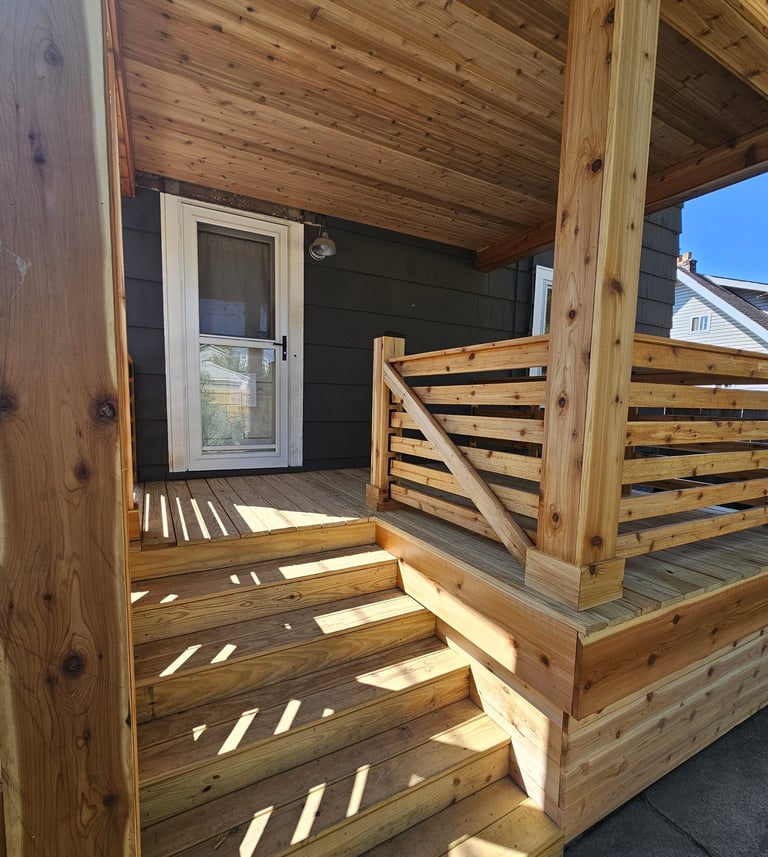 This project had an old back porch that the client wanted to tear off and replace. We removed, rebuilt to a larger footprint and almost entirely wrapped everything in cedar and installed custom cedar railings. The new porch got a new roof and gutters and new vertical vinyl board and batten siding.