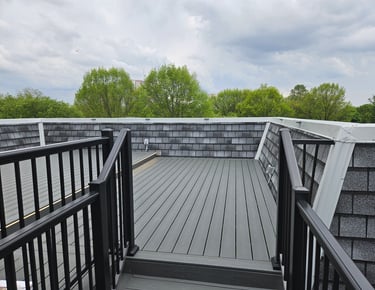 All gutters and downspouts were replaced as well. The roof deck substructure was rebuilt per new city code/specs. Trex composite decking was used in Clam Shell grey color. For the railings, we used black Aria powder coated aluminum for the project. New outdoor outlets were installed to the deck along with new flood, rope and solar lighting.